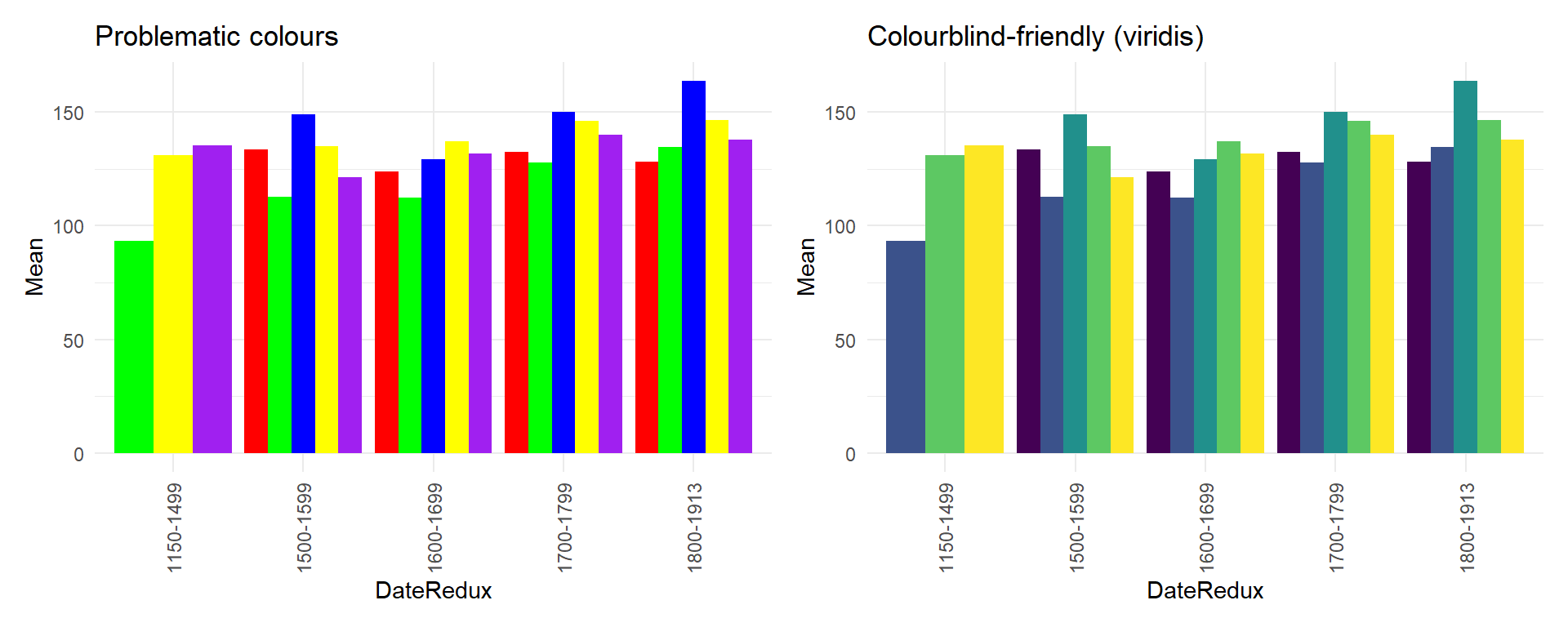 Approximately 8% of men and 0.5% of women have some form of colour vision deficiency. Designing accessible plots benefits all readers, not only those with colour vision differences.