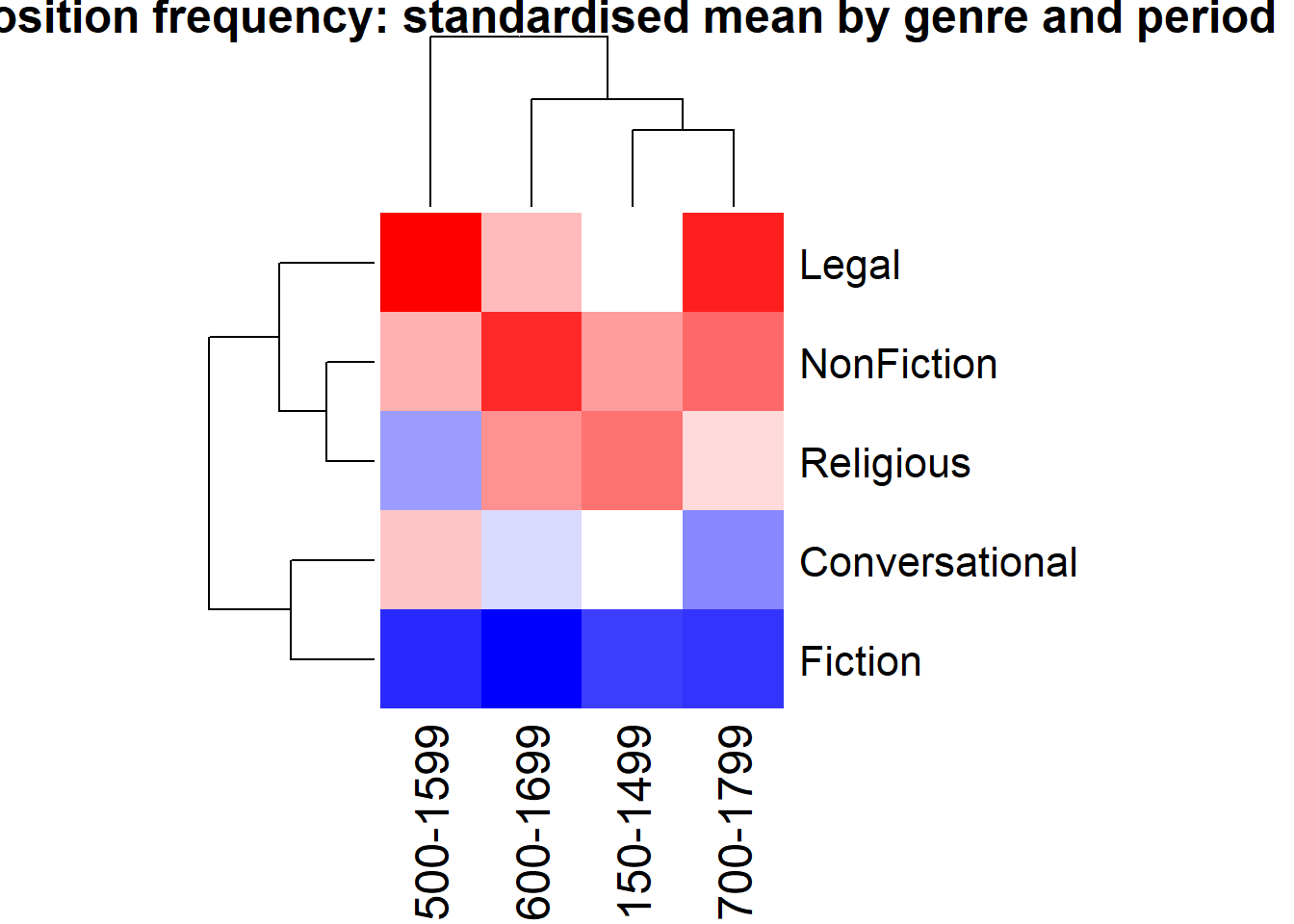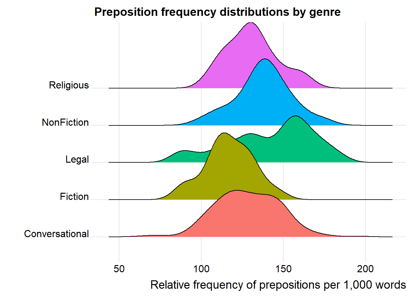Which genres show the greatest variability in preposition use, and what might this reflect about genre norms?