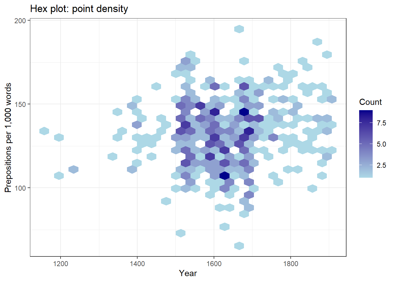 pdat |>ggplot(aes(x = Date, y = Prepositions)) +geom_hex() +scale_fill_gradient(low ="lightblue", high ="darkblue",name ="Count") +theme_bw() +labs(x ="Year", y ="Prepositions per 1,000 words",title ="Hex plot: point density")