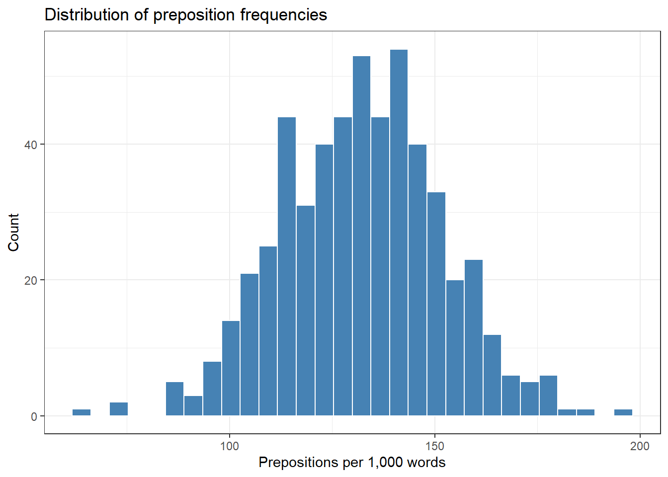 ggplot(pdat, aes(Prepositions)) +geom_histogram(bins =30, fill ="steelblue", color ="white") +theme_bw() +labs(title ="Distribution of preposition frequencies",x ="Prepositions per 1,000 words",y ="Count")