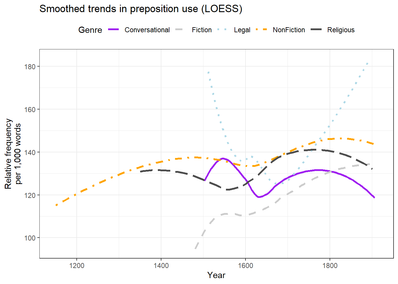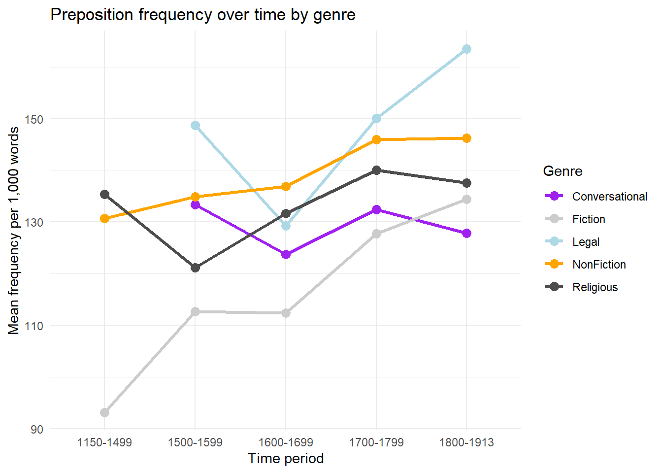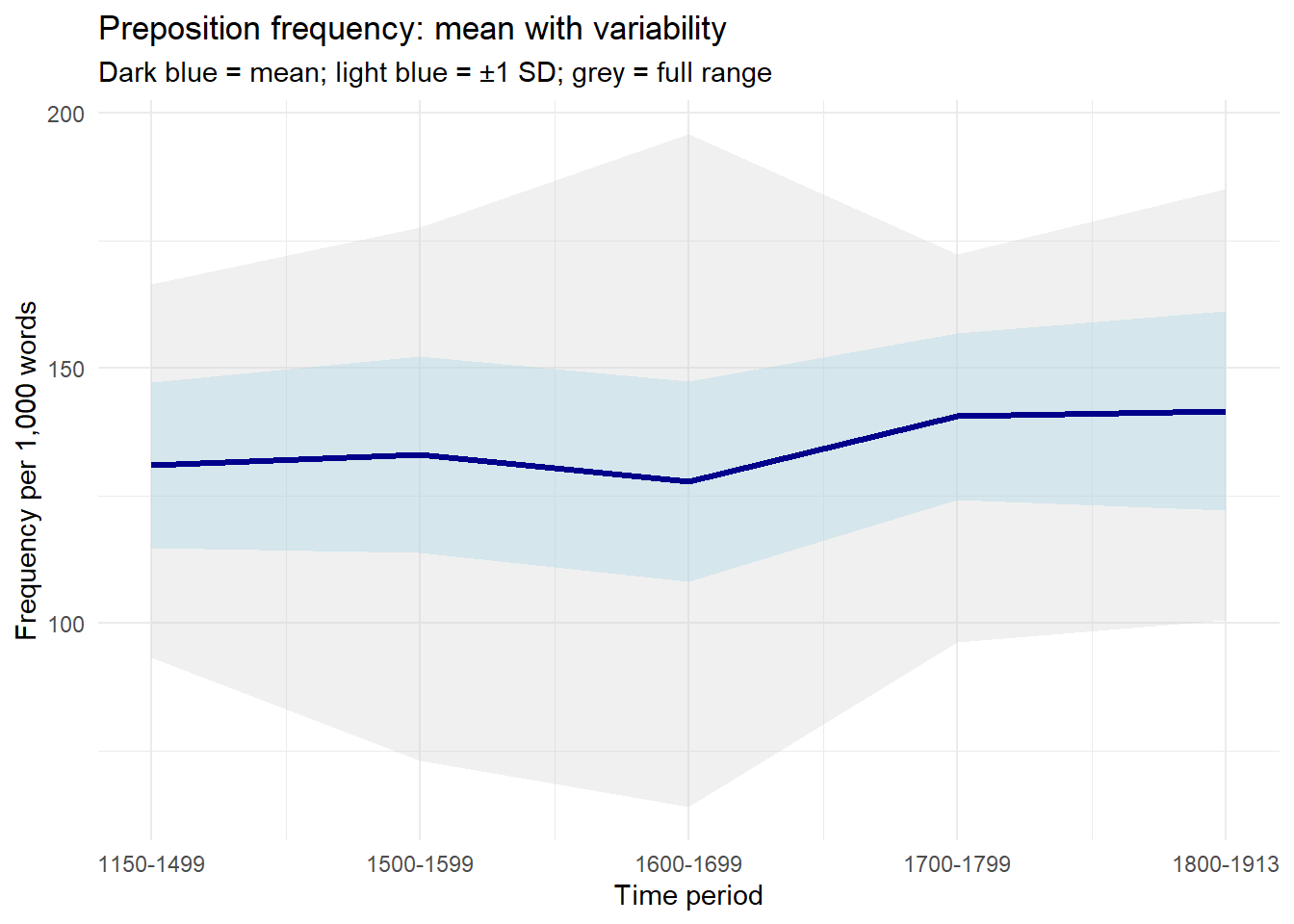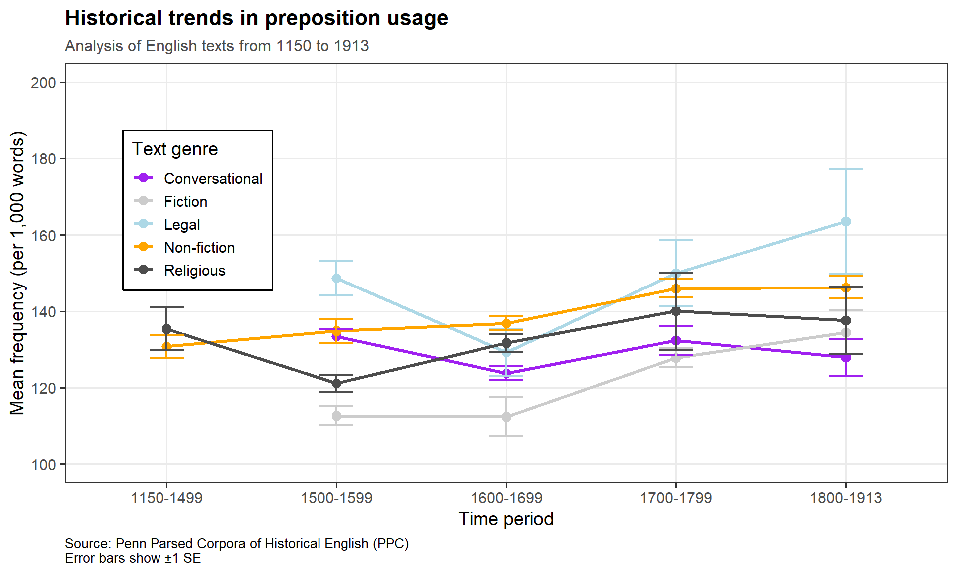 pdat |> dplyr::group_by(DateRedux, GenreRedux) |> dplyr::summarise(Mean =mean(Prepositions),SE =sd(Prepositions) /sqrt(n()),N =n(),.groups ="drop" ) |>ggplot(aes(x = DateRedux, y = Mean,color = GenreRedux, group = GenreRedux)) +geom_line(linewidth =1.2) +geom_point(size =3) +geom_errorbar(aes(ymin = Mean - SE, ymax = Mean + SE),width =0.2, linewidth =0.8) +scale_color_manual(name ="Text genre",values = clrs,labels =c("Conversational", "Fiction", "Legal", "Non-fiction", "Religious") ) +scale_y_continuous(breaks =seq(100, 200, 20), limits =c(100, 200)) +theme_bw(base_size =14) +theme(legend.position =c(0.15, 0.65),legend.background =element_rect(fill ="white", color ="black"),panel.grid.minor =element_blank(),plot.title =element_text(face ="bold", size =16),plot.subtitle =element_text(size =12, color ="gray30"),plot.caption =element_text(size =10, hjust =0) ) +labs(title ="Historical trends in preposition usage",subtitle ="Analysis of English texts from 1150 to 1913",x ="Time period",y ="Mean frequency (per 1,000 words)",caption ="Source: Penn Parsed Corpora of Historical English (PPC)\nError bars show ±1 SE" )