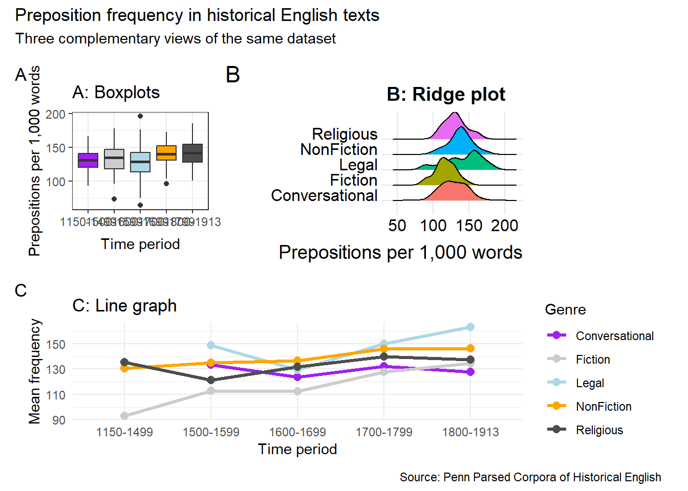 (p1 | p2) / p3 +plot_annotation(title ="Preposition frequency in historical English texts",subtitle ="Three complementary views of the same dataset",caption ="Source: Penn Parsed Corpora of Historical English",tag_levels ="A" )