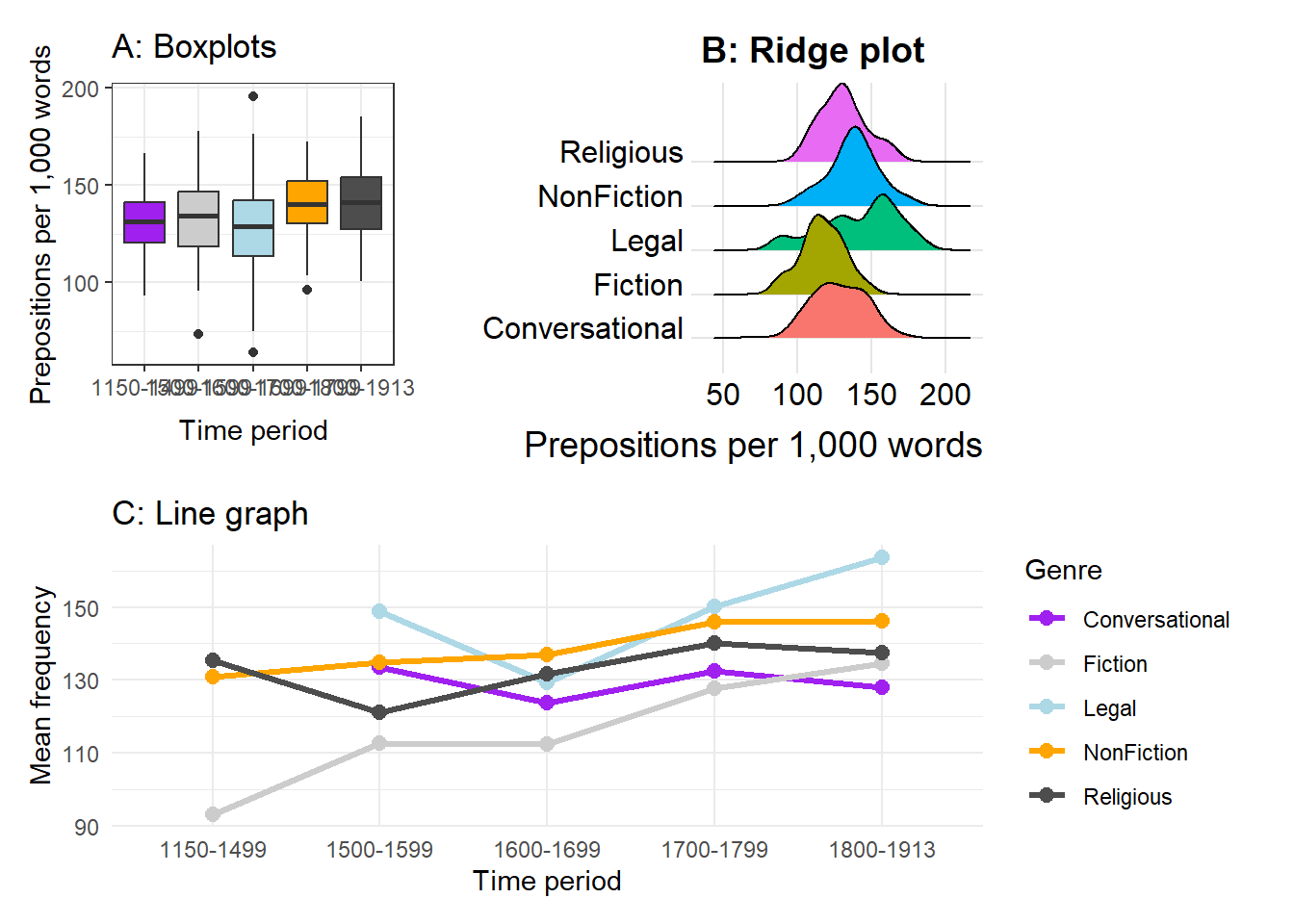 # Create three component plotsp1 <-ggplot(pdat, aes(x = DateRedux, y = Prepositions, fill = DateRedux)) +geom_boxplot() +scale_fill_manual(values = clrs) +theme_bw() +theme(legend.position ="none") +labs(x ="Time period", y ="Prepositions per 1,000 words",title ="A: Boxplots")p2 <-ggplot(pdat, aes(x = Prepositions, y = GenreRedux, fill = GenreRedux)) +geom_density_ridges() +theme_ridges() +theme(legend.position ="none") +labs(x ="Prepositions per 1,000 words", y ="",title ="B: Ridge plot")p3 <- pdat |> dplyr::group_by(DateRedux, GenreRedux) |> dplyr::summarise(Mean =mean(Prepositions), .groups ="drop") |>ggplot(aes(x = DateRedux, y = Mean,group = GenreRedux, color = GenreRedux)) +geom_line(linewidth =1.1) +geom_point(size =2.5) +scale_color_manual(values = clrs) +theme_minimal() +labs(x ="Time period", y ="Mean frequency",color ="Genre", title ="C: Line graph")# Combine: p1 and p2 side by side, with p3 below(p1 | p2) / p3