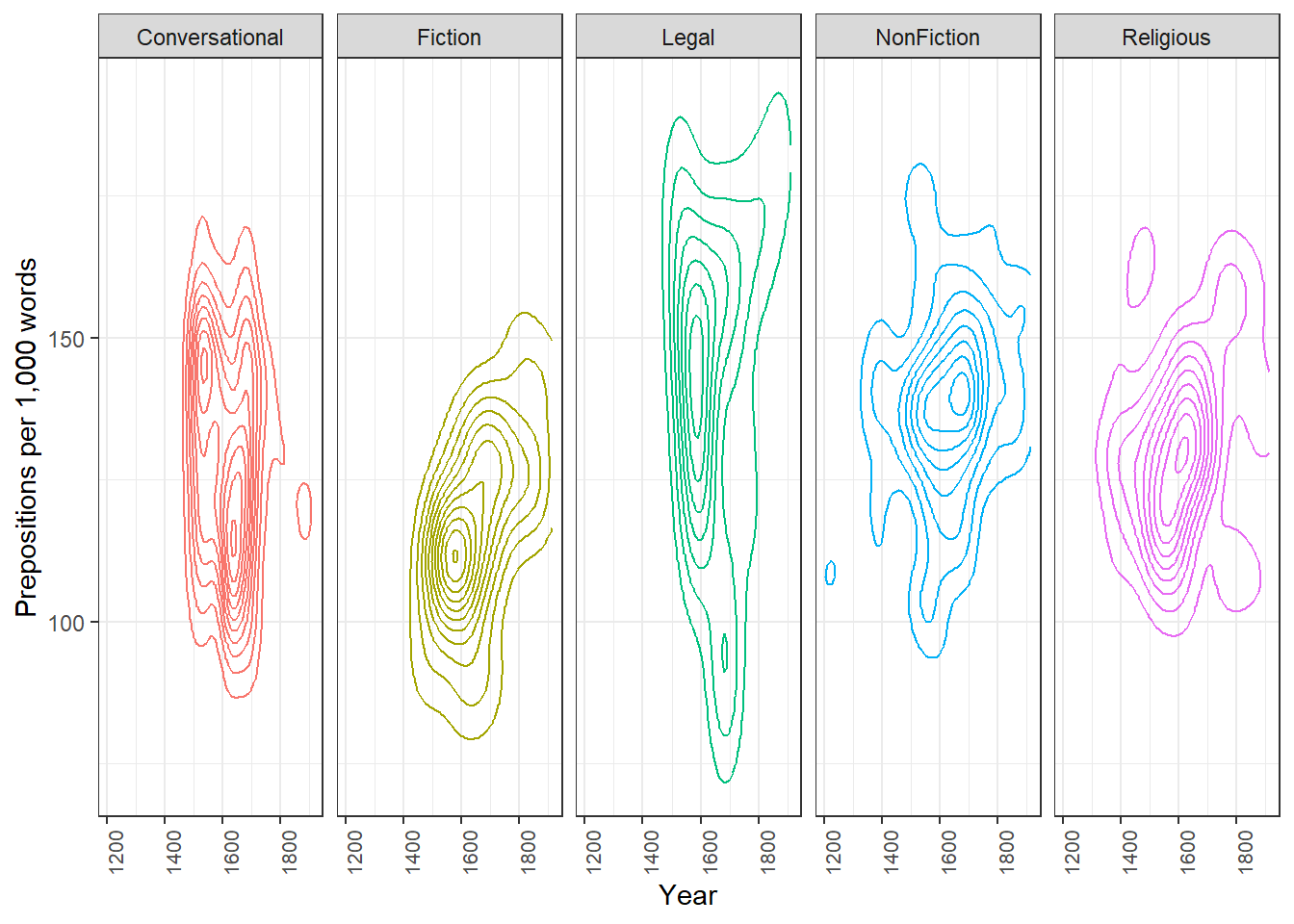 ggplot(pdat, aes(x = Date, y = Prepositions, color = GenreRedux)) +facet_wrap(vars(GenreRedux), ncol =5) +geom_density_2d() +theme_bw() +theme(legend.position ="none",axis.text.x =element_text(size =8, angle =90) ) +labs(x ="Year", y ="Prepositions per 1,000 words")