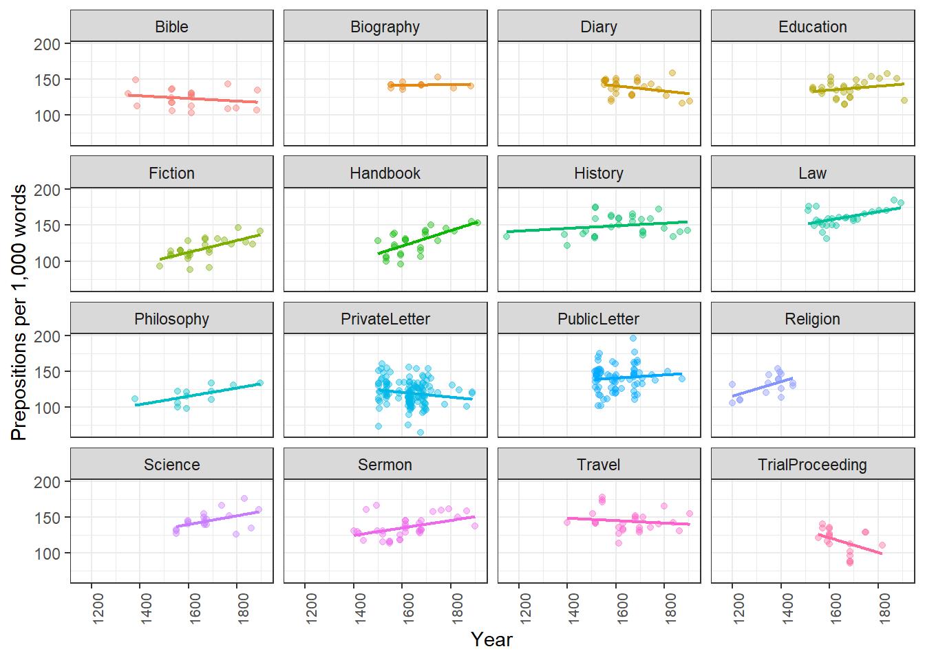 ggplot(pdat, aes(Date, Prepositions, color = Genre)) +facet_wrap(vars(Genre), ncol =4) +geom_point(alpha =0.4) +geom_smooth(method ="lm", se =FALSE, linewidth =0.8) +theme_bw() +theme(legend.position ="none",axis.text.x =element_text(size =8, angle =90) ) +labs(x ="Year", y ="Prepositions per 1,000 words")