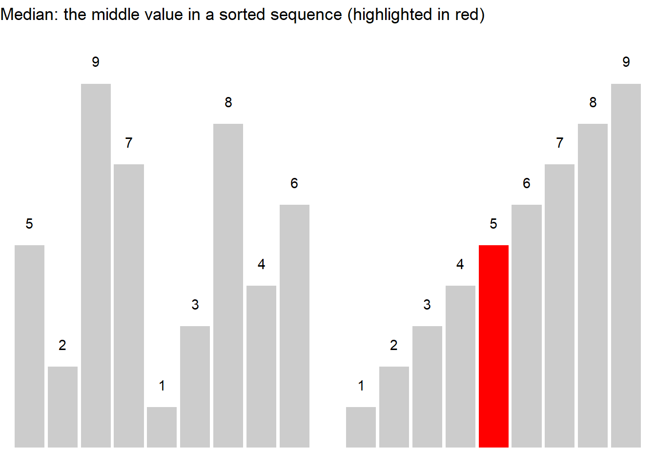 \[\text{median}(x) = \begin{cases} x_{\frac{n+1}{2}} & \text{if } n \text{ is odd} \\ \frac{1}{2}\left(x_{\frac{n}{2}} + x_{\frac{n}{2}+1}\right) & \text{if } n \text{ is even} \end{cases}\]