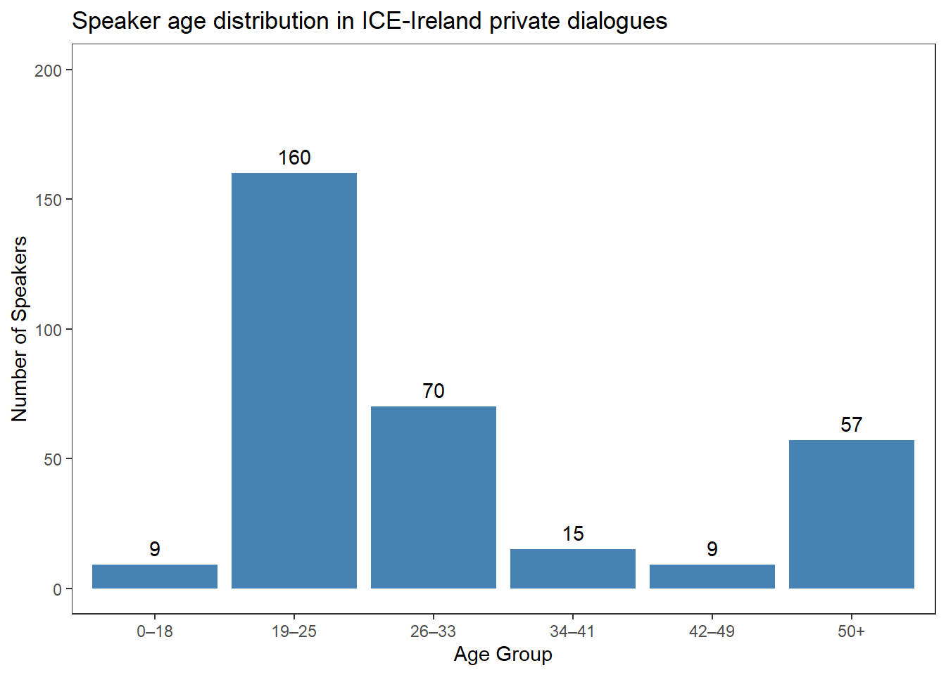 Consider the age distribution of speakers in the private dialogue section of the Irish component of the International Corpus of English (ICE-Ireland):