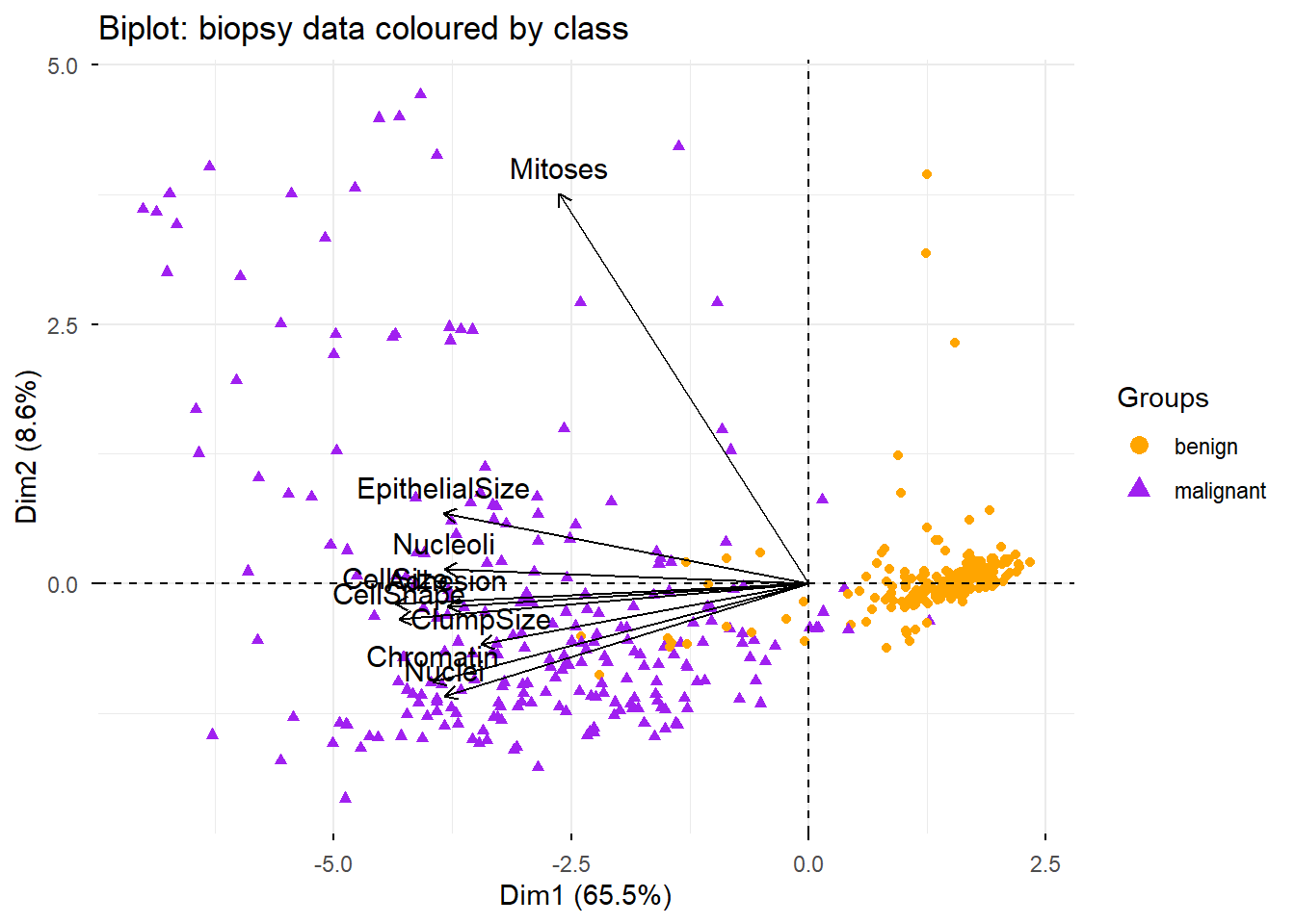 PCA can tell us if and how many groups there are in our data, and it can tell us what features are responsible for the division into groups.
