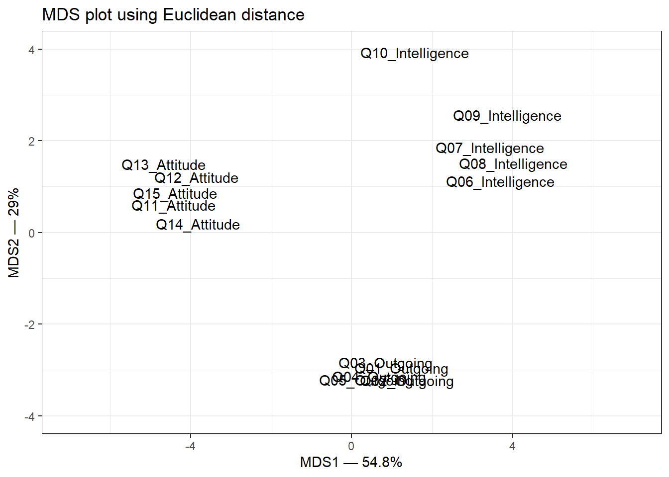 Three groups are clearly visible, corresponding to the three constructs. Q10_Intelligence sits apart from the other intelligence items, further confirming that it is a problematic item that does not reliably reflect the intelligence construct.