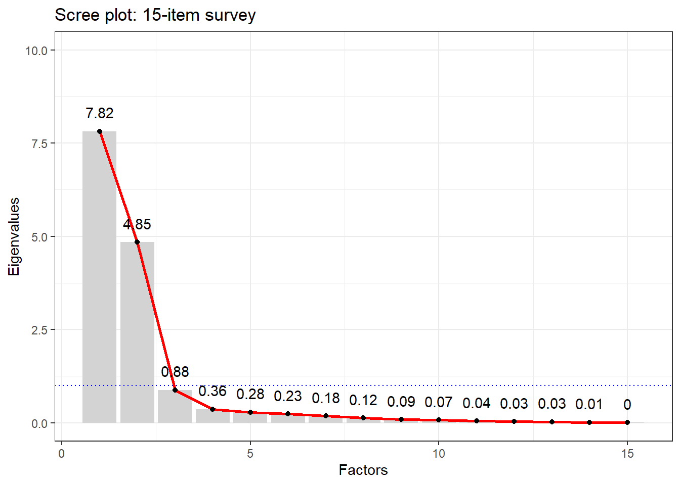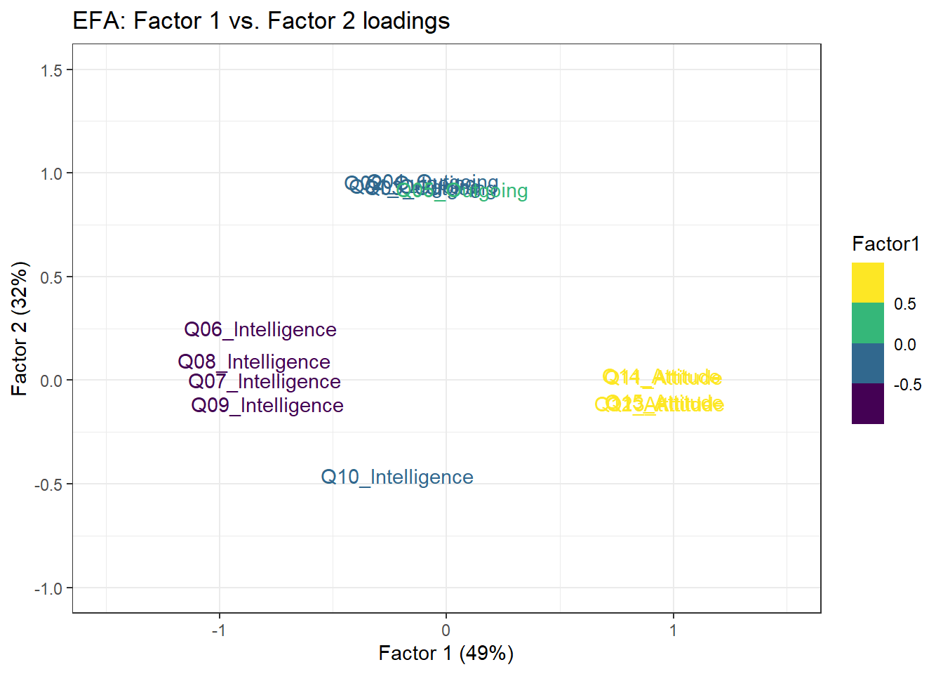 Uniqueness scores — the proportion of each variable’s variance not explained by the common factors. A high uniqueness score (close to 1) means the variable shares little variance with any of the factors and may be a poor indicator of any latent construct. Note that Q10_Intelligence has a high uniqueness score, consistent with what the MDS plot showed.