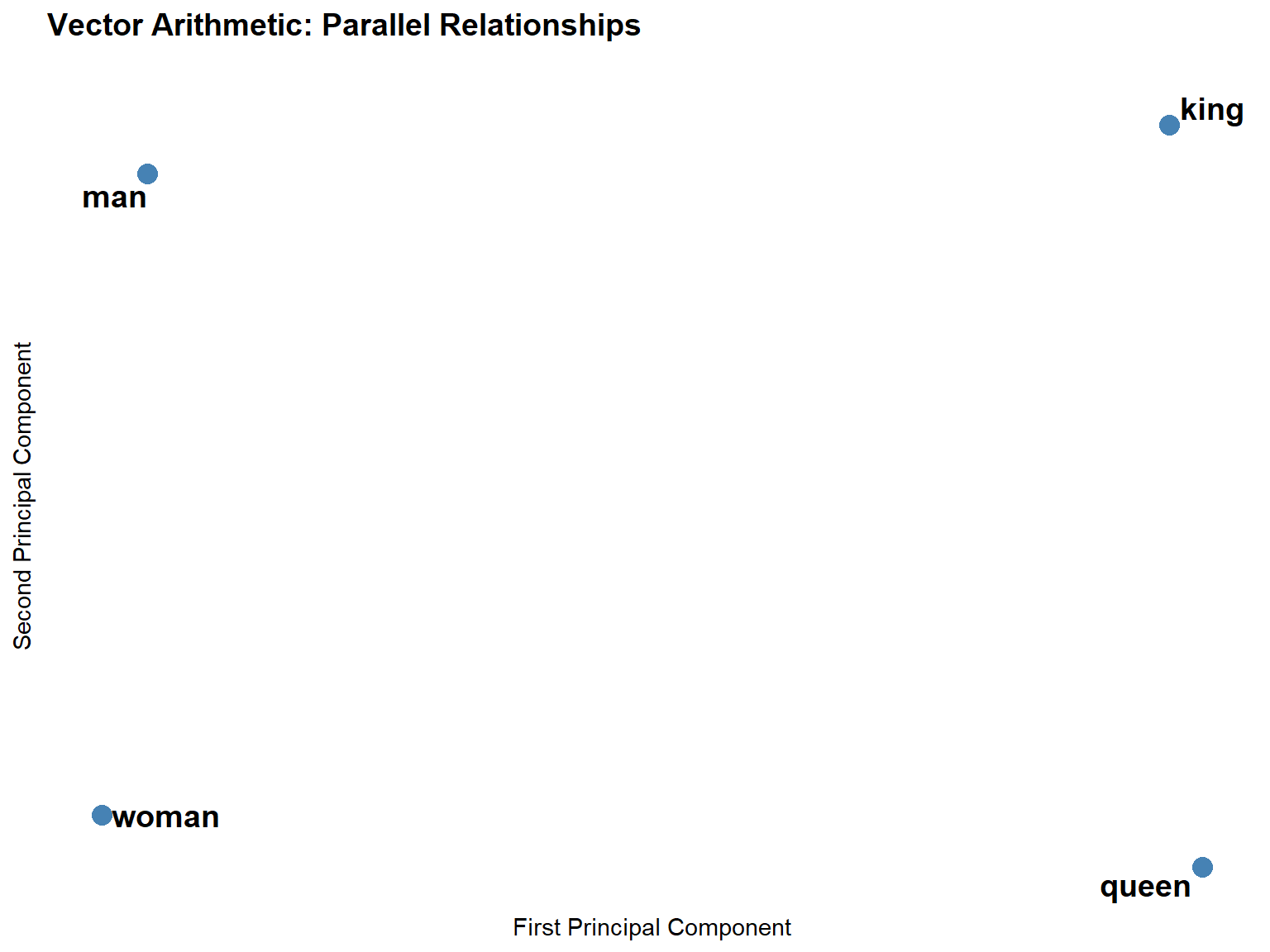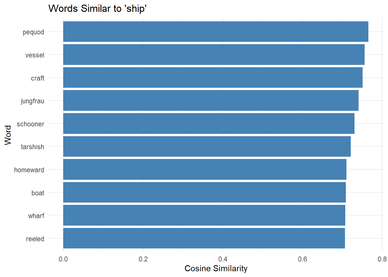 # Example: Find specialized terminology find_domain_terms <-function(model, seed_terms, top_n =50) { # Get vectors for seed terms seed_vectors <- embedding_matrix[seed_terms, ] # Average to get domain centroid domain_centroid <-colMeans(seed_vectors) # Find nearest words all_similarities <-apply(embedding_matrix, 1, function(x) { sum(x * domain_centroid) / (sqrt(sum(x^2)) *sqrt(sum(domain_centroid^2))) }) # Return top matches top_words <-names(sort(all_similarities, decreasing =TRUE)[1:top_n]) # Filter out seed terms top_words <-setdiff(top_words, seed_terms) return(top_words) } # Use it medical_seeds <-c("doctor", "patient", "hospital", "medicine") medical_terms <-find_domain_terms(model, medical_seeds)