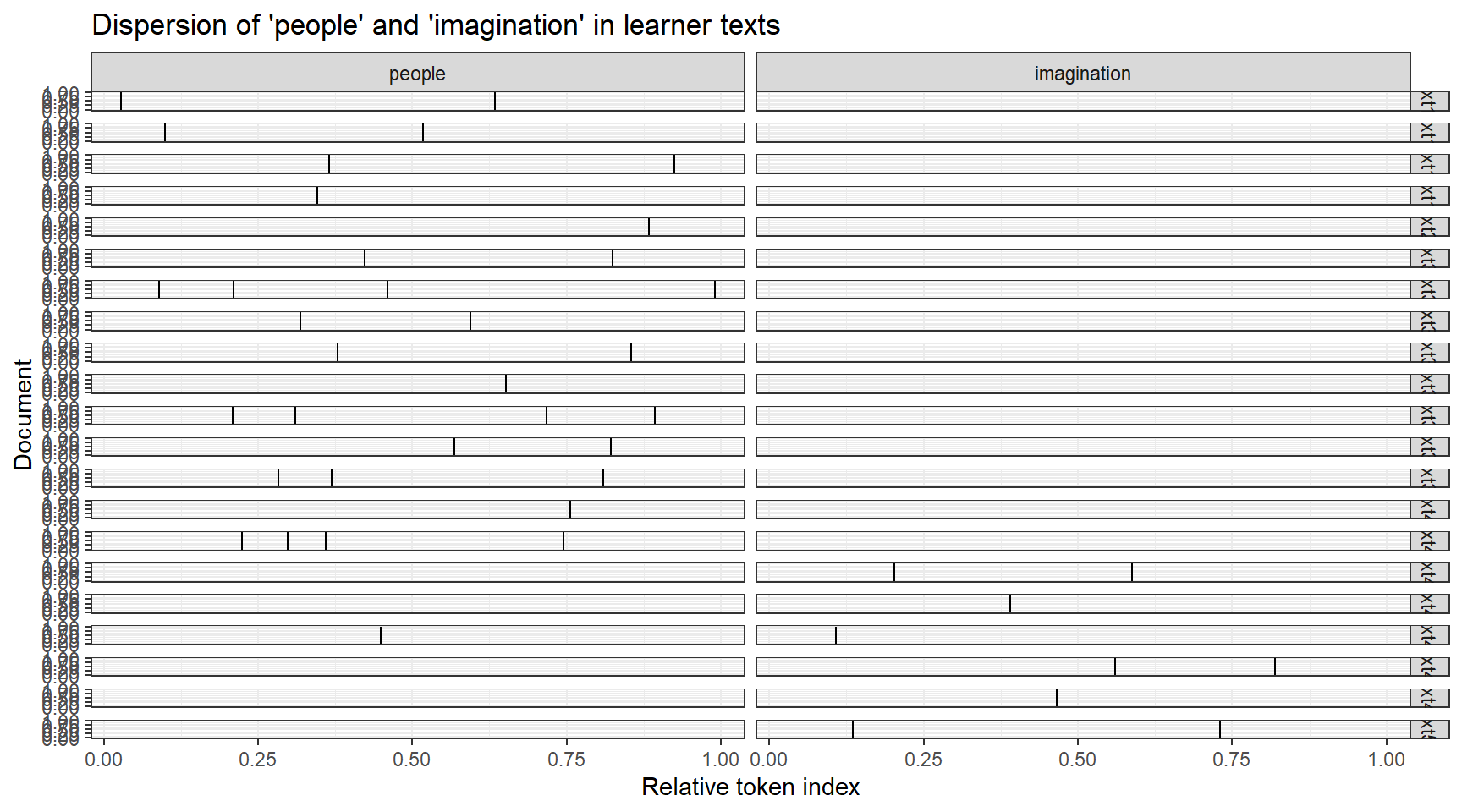 # Extract KWIC for two terms to compare their dispersion across learner textskwic_disp <- quanteda::kwic( quanteda::tokens(learner),pattern =c("people", "imagination"))quanteda.textplots::textplot_xray(kwic_disp) +theme_bw() +labs(title ="Dispersion of 'people' and 'imagination' in learner texts")