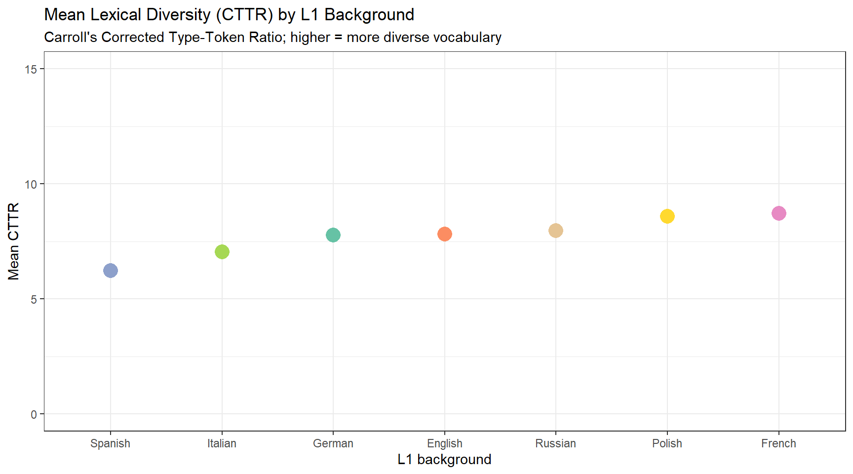 Q8. A researcher finds that Russian learners have the highest CTTR scores of all learner groups. Which interpretation is most warranted?