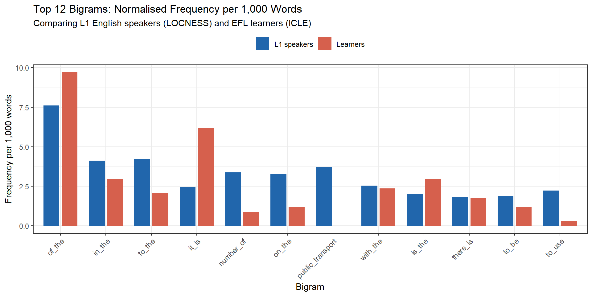 N-gram analysis — extracting bigrams and comparing their use between learners and L1 speakers