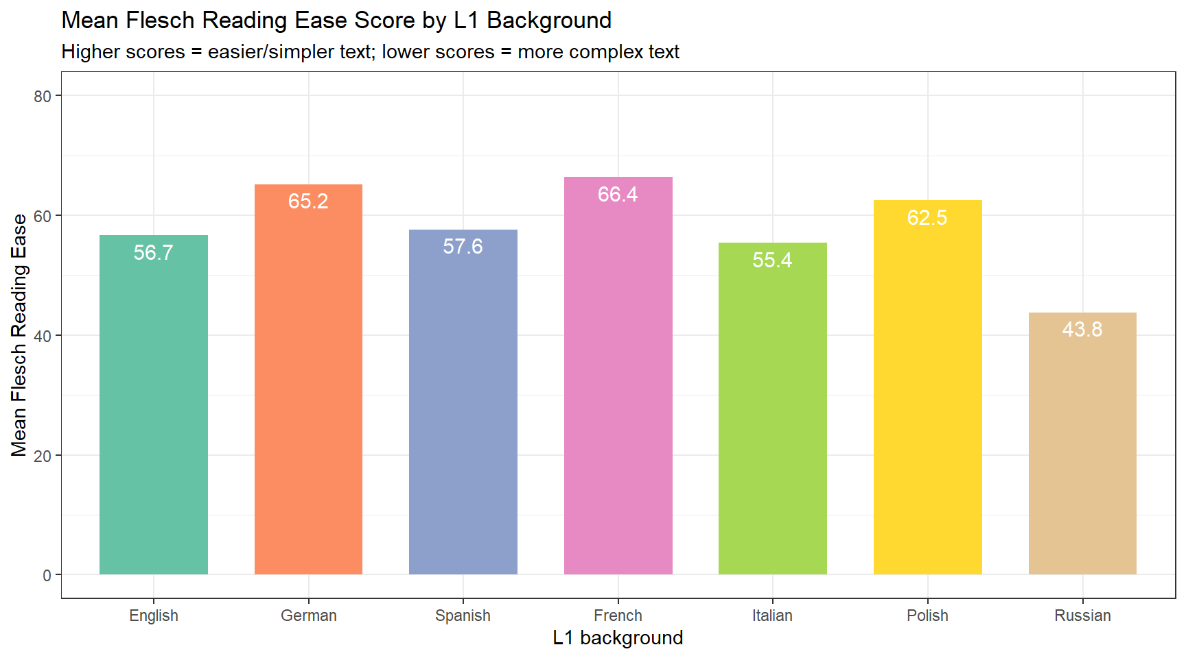 Readability measures quantify how easy or difficult a text is to read and comprehend. They are used in learner corpus research as indirect measures of writing quality and complexity. A text written by a highly proficient learner should be neither excessively simple nor unnecessarily complex. Here we focus on the Flesch Reading Ease score(Flesch 1948):