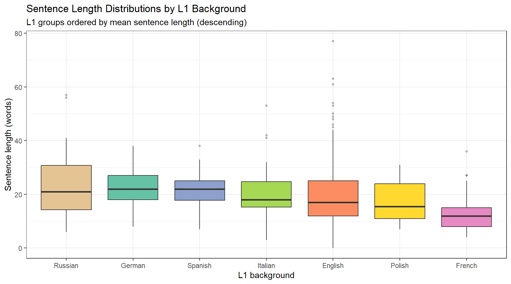 What you’ll learn: How to use the hunspell package to detect words not found in a standard English dictionary, how to compute a normalised spelling error rate, and how to compare it across L1 groups