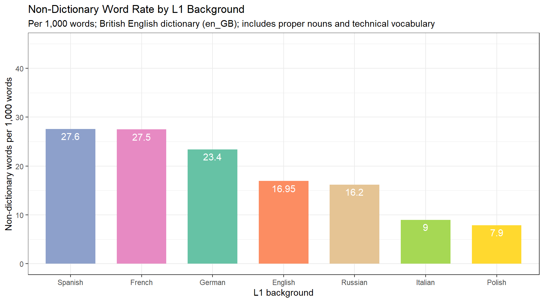 err_tb |>ggplot(aes(x =reorder(l1, -freq), y = freq, label = freq, fill = l1)) +geom_col(width =0.7) +geom_text(vjust =1.5, colour ="white", size =4) +scale_x_discrete(labels = l1_labels) +scale_fill_brewer(palette ="Set2", guide ="none") +coord_cartesian(ylim =c(0, 45)) +theme_bw() +labs(title ="Non-Dictionary Word Rate by L1 Background",subtitle ="Per 1,000 words; British English dictionary (en_GB); includes proper nouns and technical vocabulary",x ="L1 background",y ="Non-dictionary words per 1,000 words" )