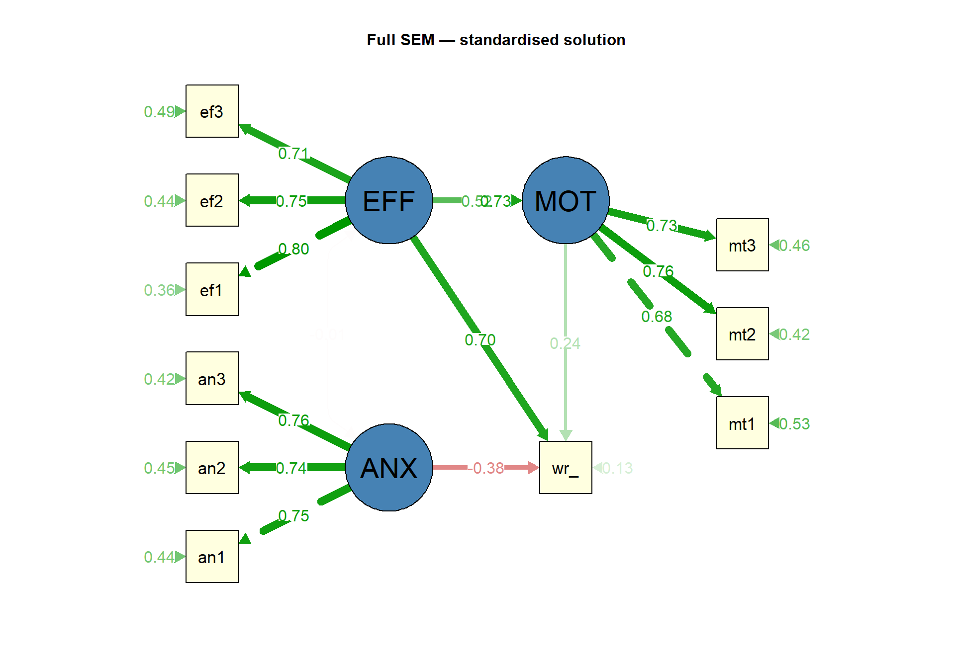 A three-factor measurement model was specified a priori based on the theoretical framework, with Language Anxiety (ANX), Writing Self-Efficacy (EFF), and Motivation (MOT) each indicated by three Likert-scale items (nine indicators in total). The model was estimated using Maximum Likelihood in R (lavaan). Model fit was excellent: χ²(df) = X.XX, CFI = .97, TLI = .96, RMSEA = .04 [90% CI: .01, .07], SRMR = .04. All standardised factor loadings were significant and exceeded 0.70 (range: .71–.82), and McDonald’s ω exceeded .80 for all three scales, indicating good reliability. The measurement model was retained for subsequent structural analysis.