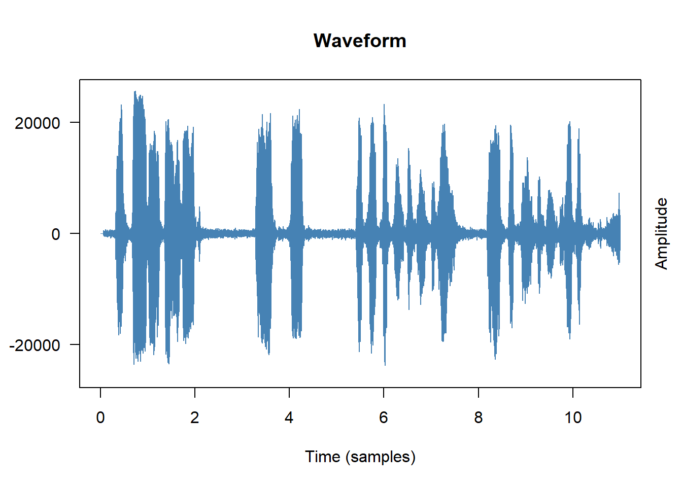 # Key properties accessed via slots sampling_rate <- wav@samp.rate # samples per second (e.g., 16000) bit_depth <- wav@bit # bit depth (16 = standard) n_samples <-length(wav@left) # number of samples (mono: @left only) n_channels <-ifelse(wav@stereo, 2, 1) # Calculate duration in seconds duration_sec <- n_samples / sampling_rate cat("Duration: ", round(duration_sec, 2), "seconds\n")