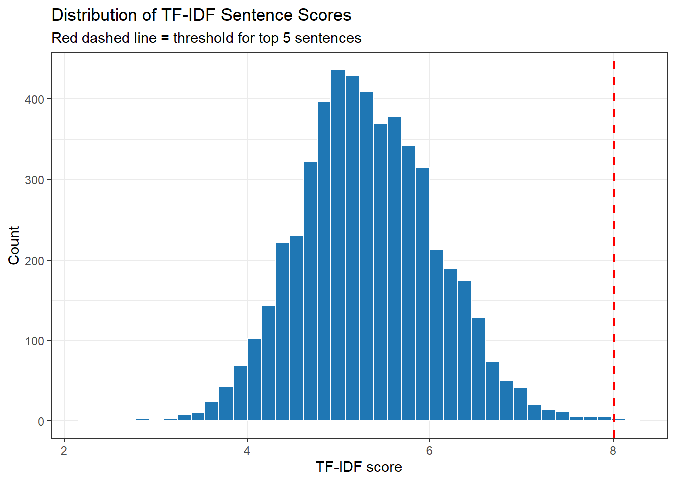 TF-IDF scoring computes a relevance score for each sentence based on the term frequency–inverse document frequency weights of the words it contains. A sentence scores highly if it contains many words that are frequent in this text but rare in a reference corpus. This approach rewards sentences that contain the distinctive vocabulary of the document and is particularly transparent: the score of each sentence is a direct function of its word content.